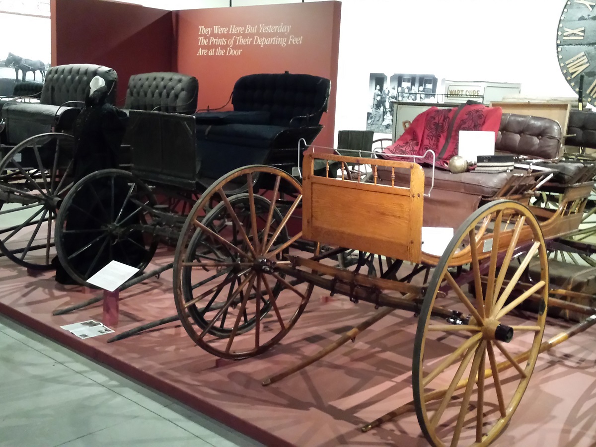 The collection, which was owned and used in the Lake Sunapee area by summer resident Frank L. Boyden, Headmaster of Dearfield Academy for an unbelievable sixty-six years, from 1902 to 1968, comprises four vehicles: a pair of two-seated carriages, one painted black and one natural wood, and two single-seated buggies. Boyden kept a dozen more buggies and four horses at his home in Massachusetts and in 1953 wrote: "I am really quite lonesome as I go out, because I guess I am the last one driving a horse." He never learned to drive his black Cadillac but in later years sped around the school's campus on a golf cart. The four carriages were bequeathed to the Society upon his death in 1972.
