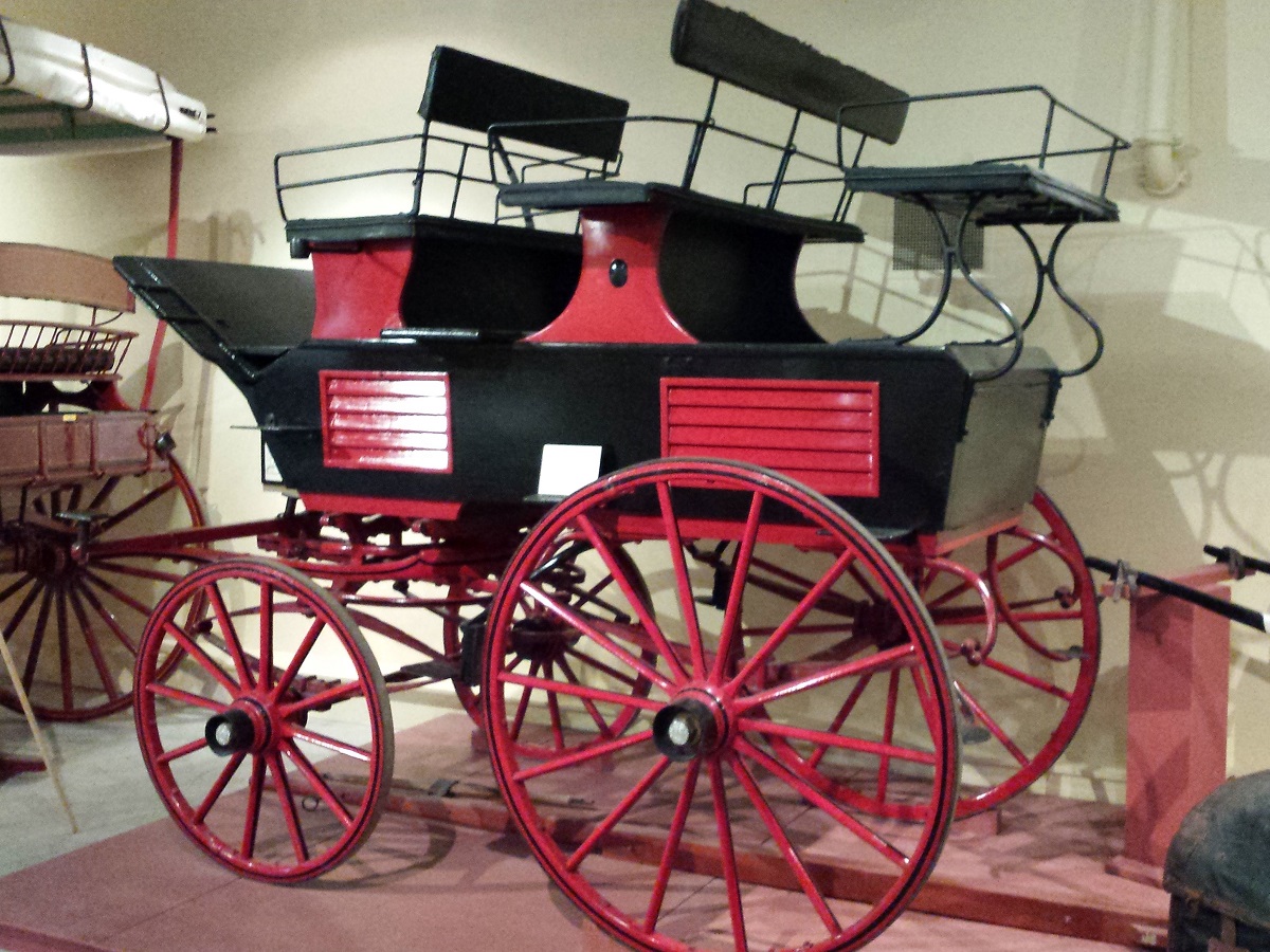 This vehicle, which is a "break", not a "coach", is purported to have carried passengers between Boston and Manchester. It could seat nine and carry freight as well, and its sturdy leaf springs reportedly ensured a "comfortable" ride. For many years, it sat in a Wilmot barn before the Society learned of it in 1970. Through the generosity of Mr. and Mrs. Walter Ensign, this distinctive roof-seat break was purchased and given to the Society. In 2003, the vehicle was professionally restored to its striking black and red color scheme.