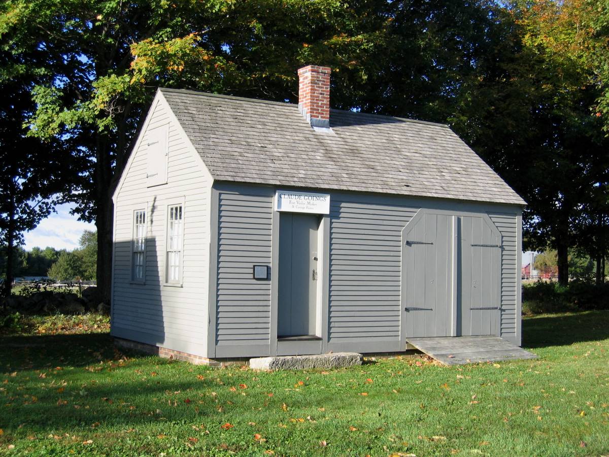 This building is of modern construction by "old-time" techniques. The frame of the building was constructed in 1991 as part of an instructional class on timber framing, by Richard Lawson and friends. It was then allowed to weather for two years, after which a granite foundation was constructed and the frame moved into place. The Society's carpentry crew, led by Bud Lauridsen and Bill Roos, completed the walls, roof, and interior details in 1993. During the winter and spring of 1994, a collection of violins, tools and artifacts of violin making, given by Ade and Bud Lauridsen, was placed in this building. It was designed specifically to recognize the craft of Claude Goings, a Civil War veteran and New London resident who made his living painting carriages and making and repairing violins (and at least one banjo). Claude and his family lived at the corner of King Hill Road and Rte 103A in the mid 1800s. It is unknown if Claude had a separate shop such as this building, or if he simply used space in a barn for his work.